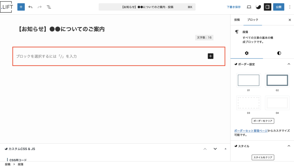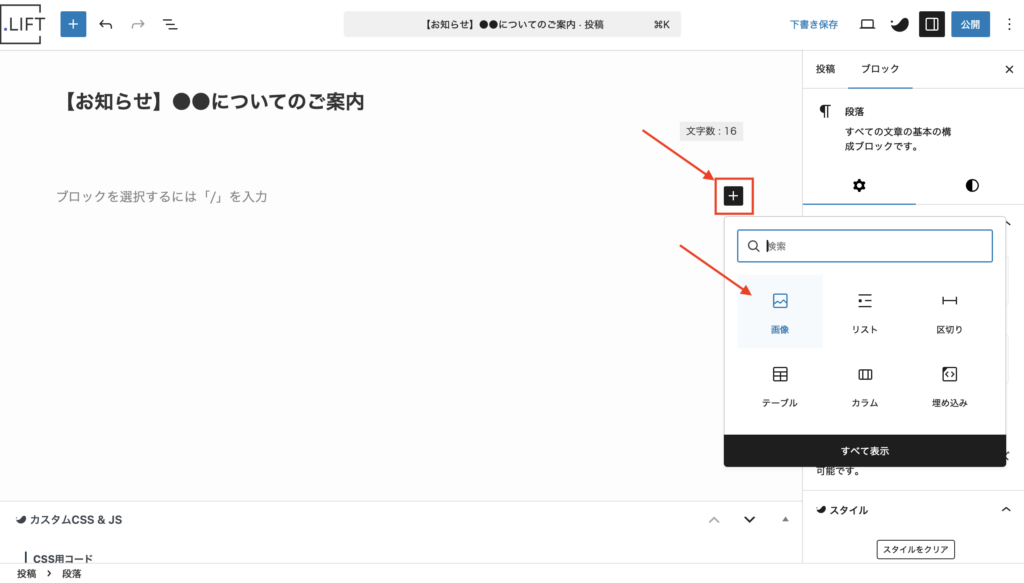 - 「+」を押す → 段落・見出し・画像などを追加可能