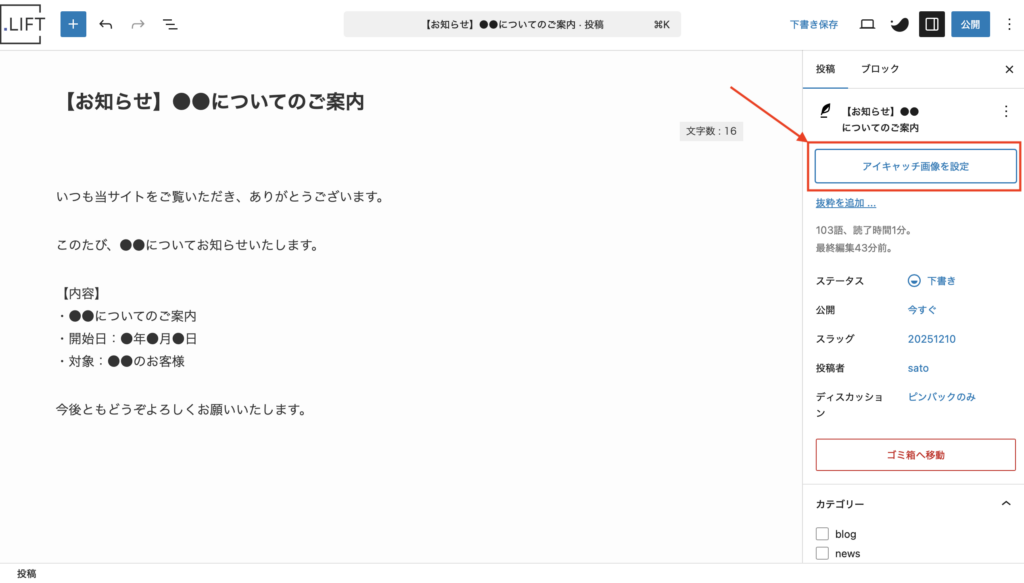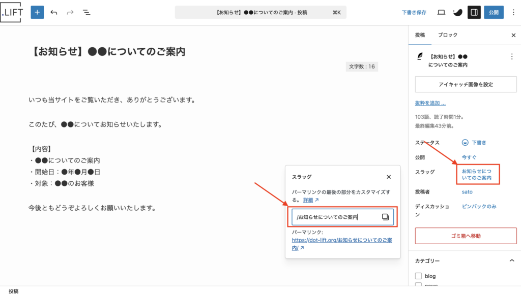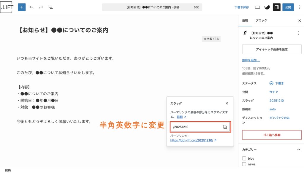 のように 日本語スラッグが自動で入ることがありますが、必ず英語に変更してください。