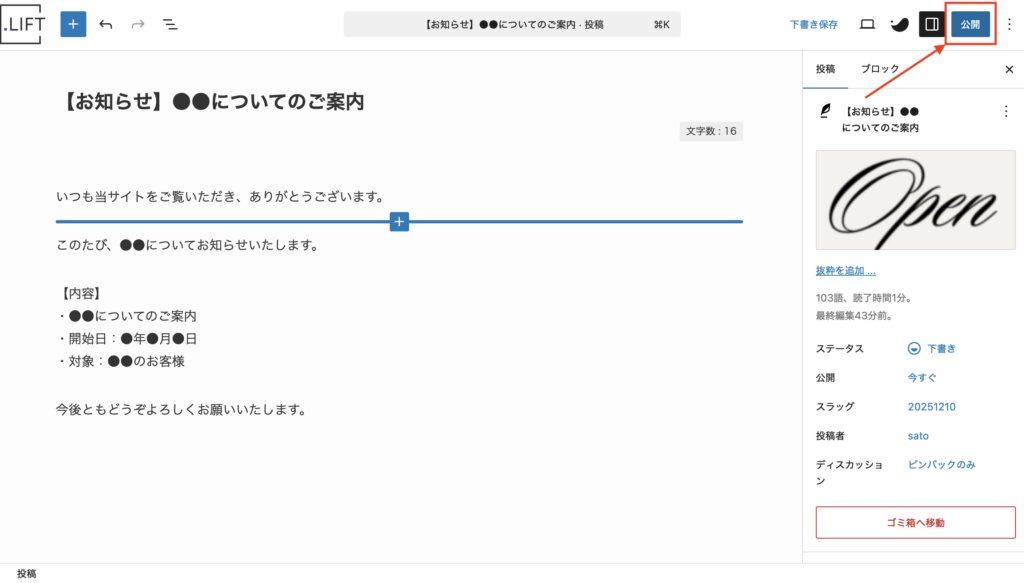 - 「投稿」タブ → 「スラッグ」 右横の青文字をクリック