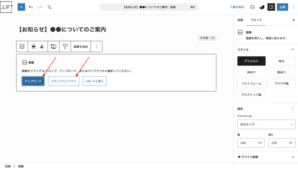 - 画像を新規追加する場合は「アップロード」、すでに追加済みの場合は「メディアライブラリ」から画像を選択